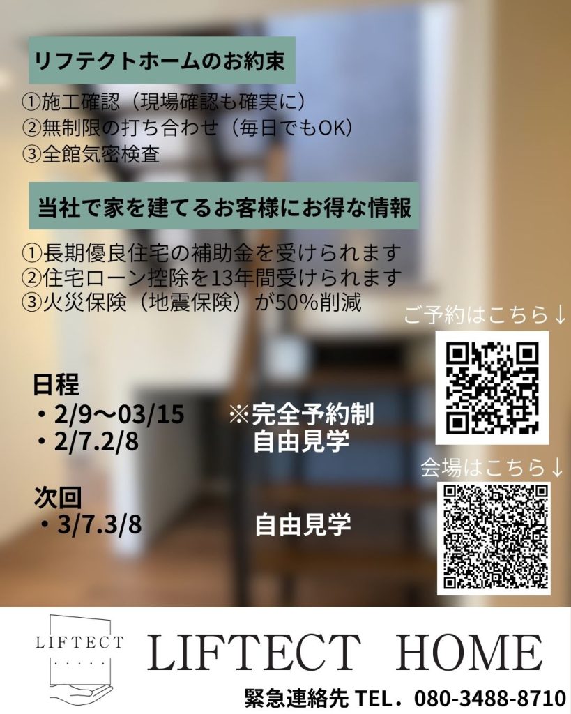HOME > お知らせ > LIFTECTの家 OPNE HOUSE in 森町一宮 2026年1月30日 こんにちは。 リフテクトホームです。 この度は、お客様のご厚意により、現場完成見学会を開催されることとなりました。 詳細を載せましたので、ご覧ください。 当日は、たくさんのご来場お待ちしております。